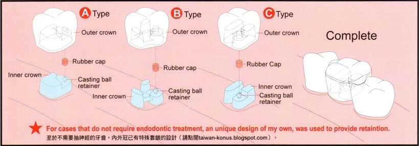 而Konus是雙層的假牙,分為內冠及外冠,內冠是用黃金材質製造(延展性佳),兩層牙冠無任何卡榫機關,而是用金屬表面摩擦力來抓住外冠防止脫落,由於摩擦力取下及裝戴時不容易控制假牙拔下的鬆緊程度,因此林醫師將內外冠及外冠做了改良設計成卡榫構造,使Konus假牙拔下及裝戴時鬆緊程度非常穩定。